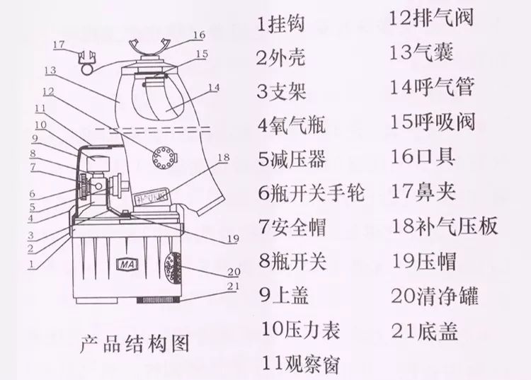 1、自救器主要由高壓系統(tǒng)、呼吸系統(tǒng)及CO2 過濾系統(tǒng)組成。高壓系統(tǒng)包括氧氣瓶、氧氣瓶開關(guān)、減壓器、自動手動補給閥和壓力表等。