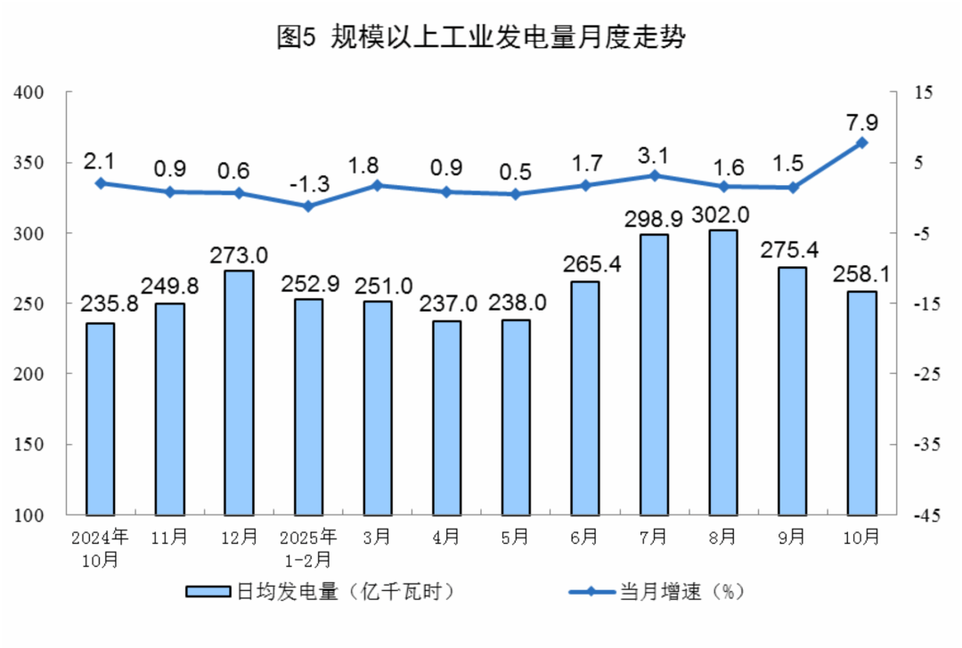10月份,規(guī)上工業(yè)發(fā)電量8002億千瓦時(shí),同比增長7.9%,增速比9月份加快6.4個(gè)百分點(diǎn);日均發(fā)電258.1億千瓦時(shí)。
